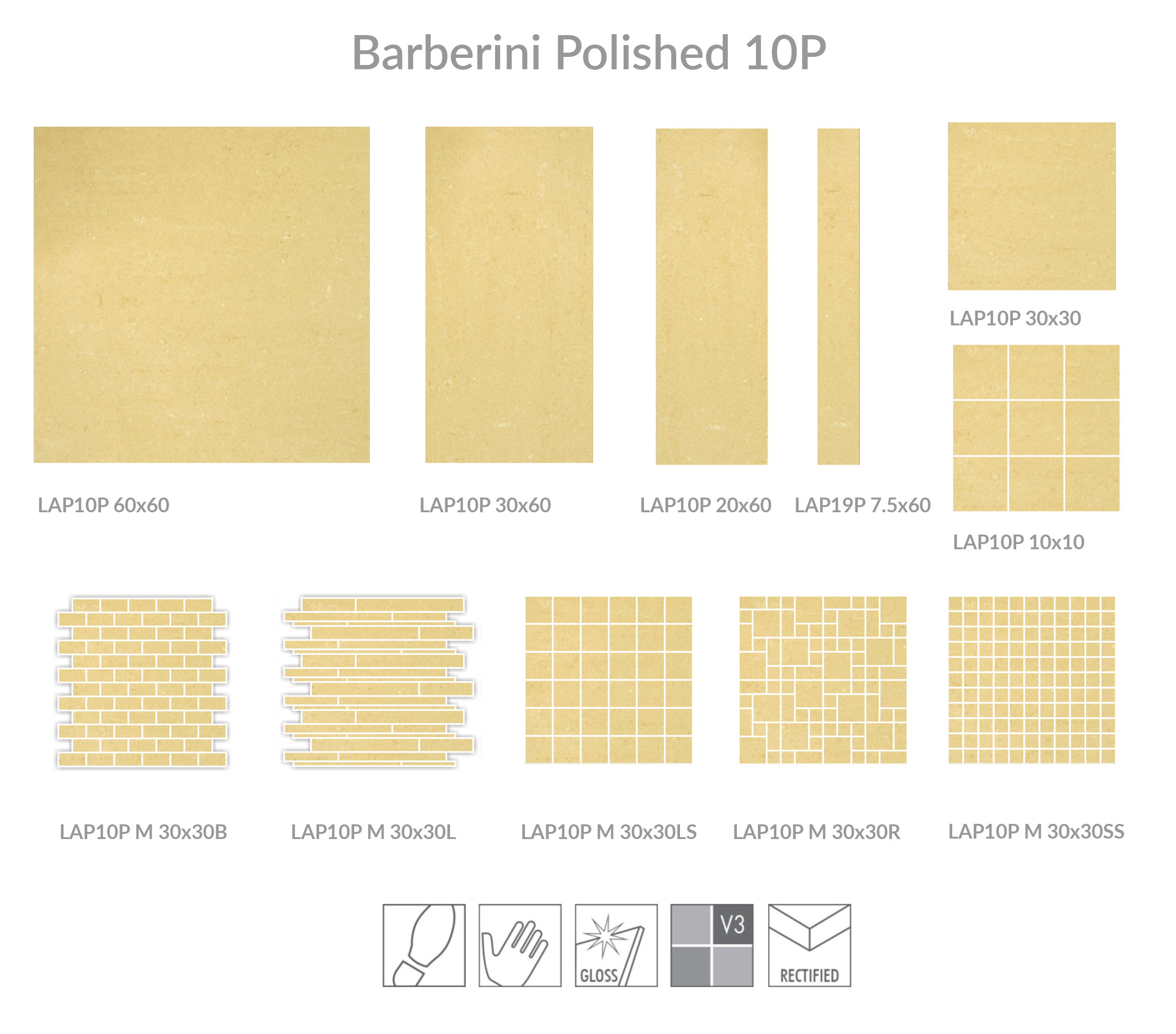 Barberini polished is available in tile and mosaic format and can be used on both walls and floors, thereby providing an excellent continuity of effect.